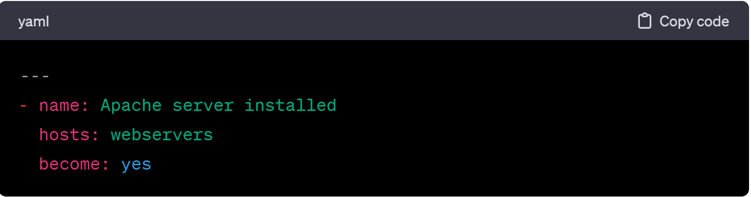 Sebuah playbook bisa sangat sederhana, seperti contoh berikut yang menginstal, sebagai pengguna berkekuatan, server HTTP Apache pada setiap node dalam grup server web departemen IT: