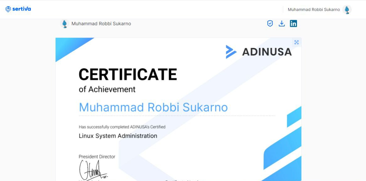 - Peserta yang dinyatakan lulus pada kursus di adinusa.id akan secara otomatis mendapatkan sertifikat digital yang dapat diakses pada portal sertiva.id.