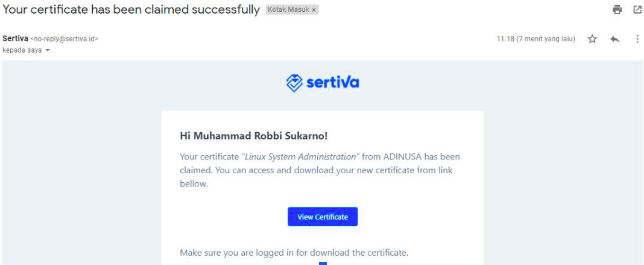 - Peserta mengecek notifikasi di email dari adinusa.id yang berisikan link untuk melakukan claim sertifikat di portal sertiva.id.