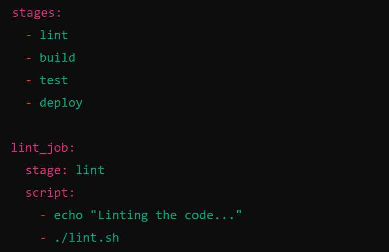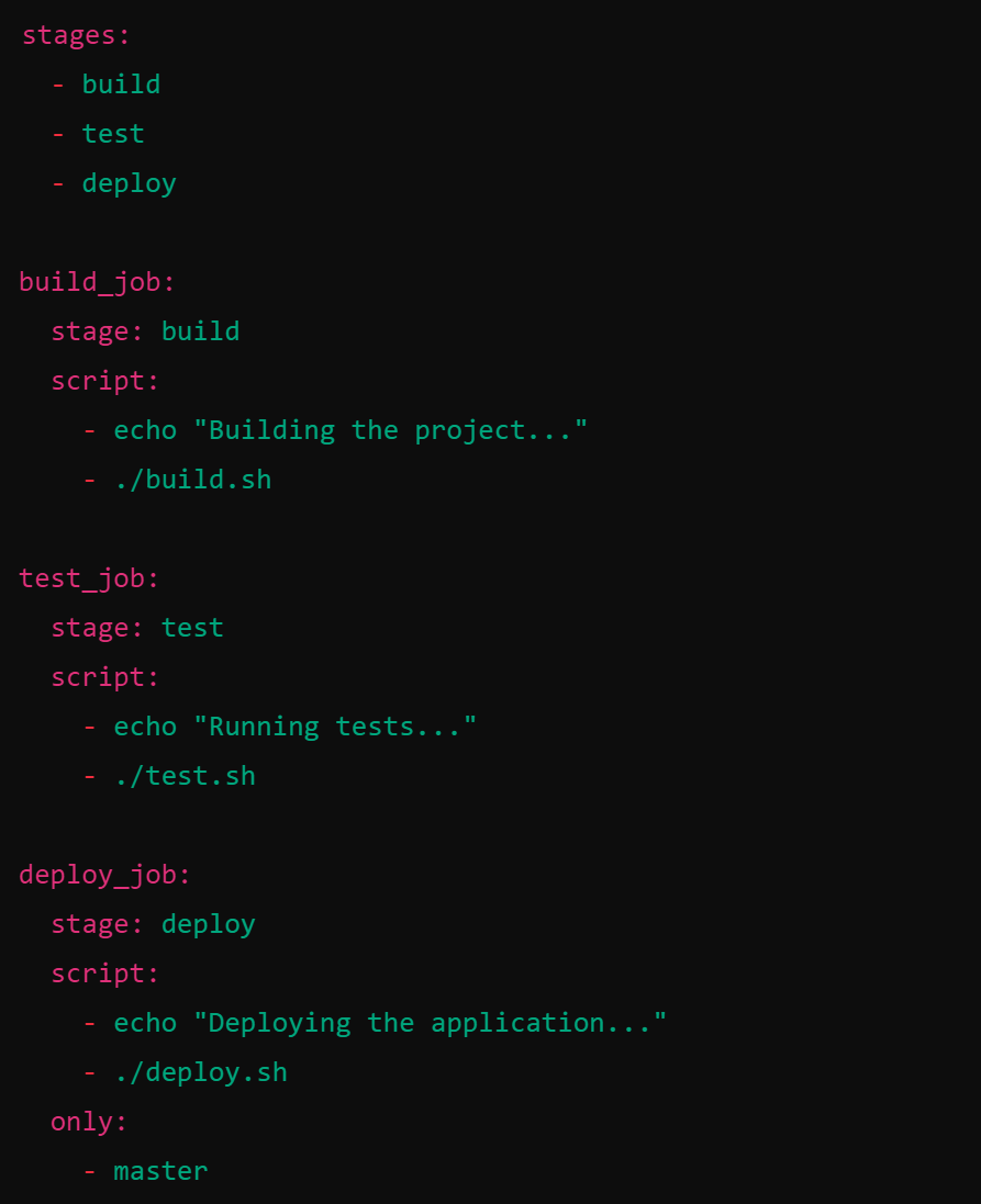 Pipeline CI/CD di GitLab terdiri dari serangkaian pekerjaan (jobs) yang berjalan dalam tahap (stages) tertentu. Pipeline didefinisikan dalam file .gitlab-ci.yml yang berada di root repositori Anda. Berikut adalah contoh sederhana dari file .gitlab-ci.yml: