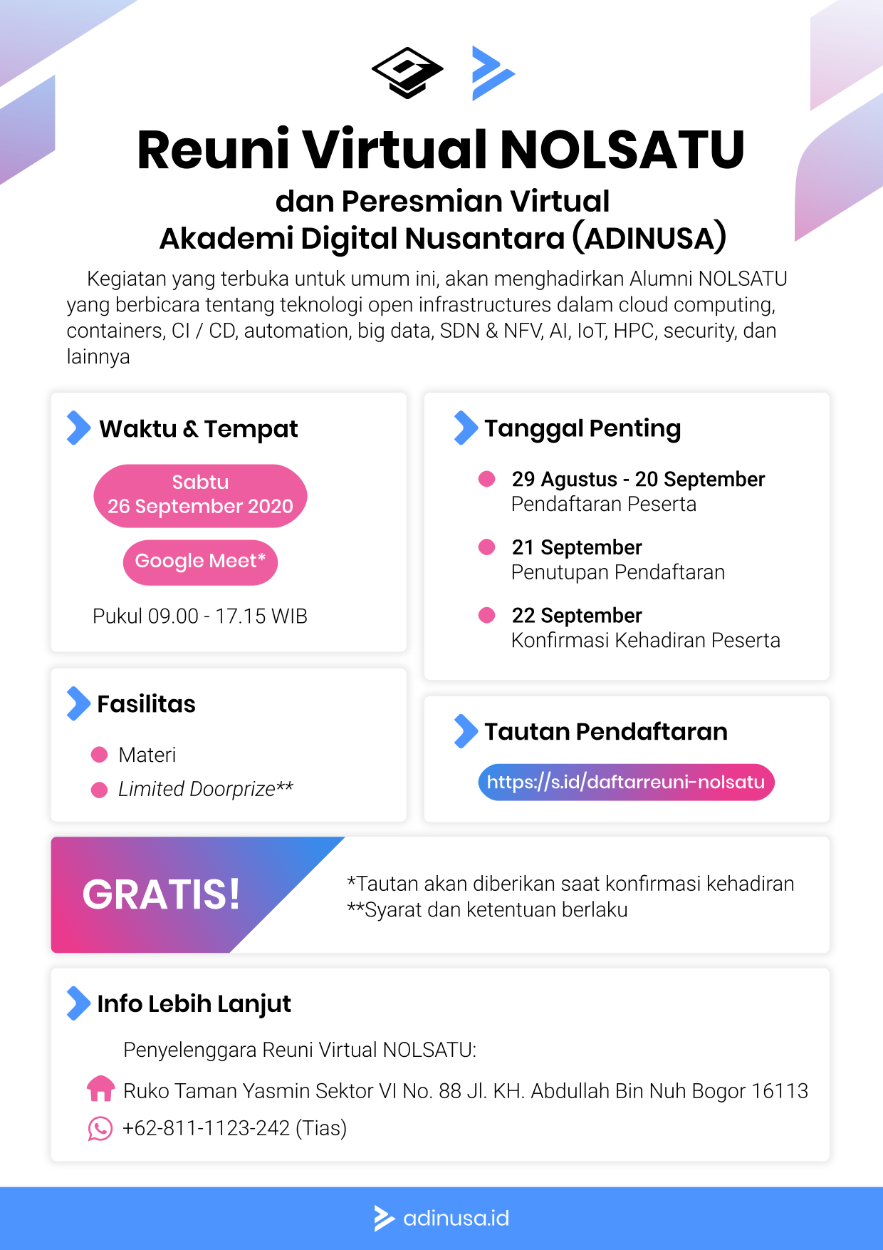 Pendaftaran kegiatan Reuni Virtual NOLSATU dan Peresmian ADINUSA sudah dibuka untuk umum. Reuni Virtual NOLSATU dihadirkan selain sebagai ajang silaturahmi bagi alumni NOLSATU, juga menjadi tempat untuk melihat perkembangan kemampuan lulusan. Reuni Virtual NOLSATU juga akan memperkenalkan lebih jauh tentang ADINUSA.