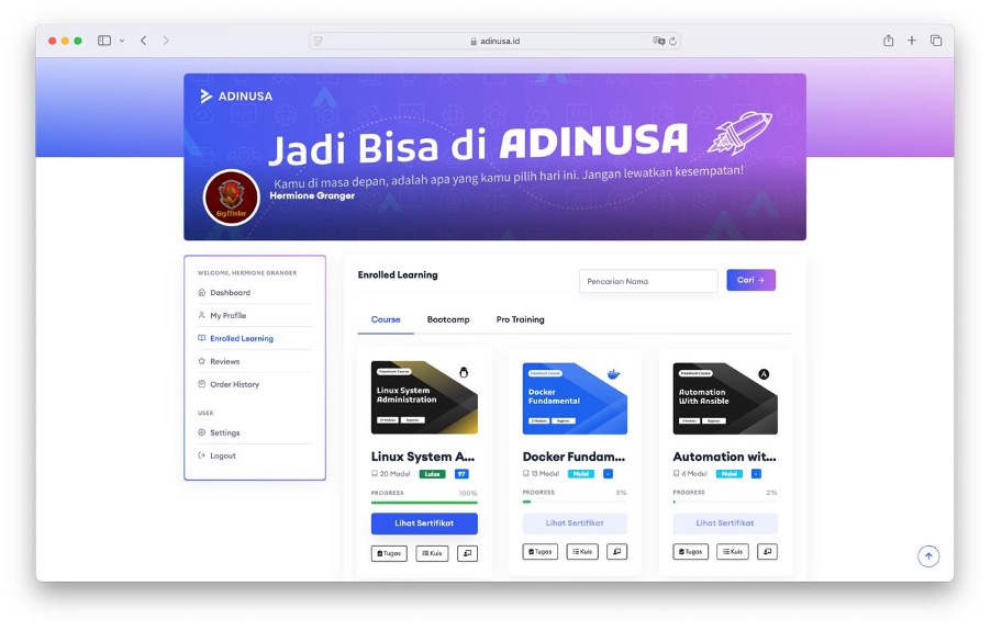 - Kamu juga dapat pergi ke Halaman Profil, dan klik sub menu “Enrolled Learning”, atau klik di link berikut https://adinusa.id/course/courses/ dan lihat pada rangkaian aktivitas yang telah Kamu ikuti di ADINUSA serta unduh sertifikatnya seperti gambar di bawah ini!