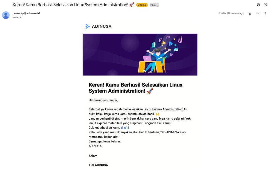 Semua materi kursus dan bootcamp di ADINUSA, baik yang tersedia secara gratis maupun berbayar, memberikan keuntungan besar bagi para penggunanya. Peserta yang berhasil menyelesaikan setiap materi akan menerima sertifikat resmi sebagai bentuk pengakuan atas keberhasilan mereka. Sertifikat ini tidak hanya menjadi bukti pencapaian, tetapi juga dapat digunakan untuk memperkuat portofolio, menambah nilai di mata perekrut, dan meningkatkan kesempatan profesional yang lebih luas. Dengan ADINUSA, kamu tidak hanya belajar, tapi juga membuka peluang besar untuk masa depan kariermu.
